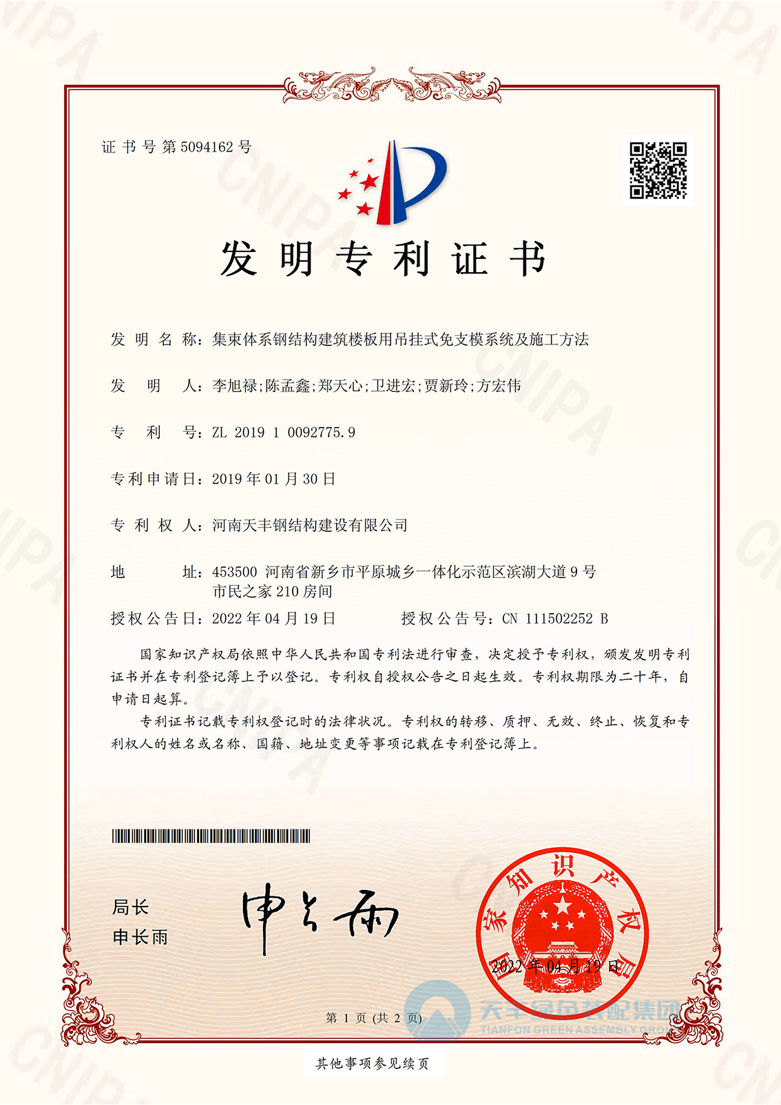 牛!天丰钢结构建设公司再获国家自主知识产权