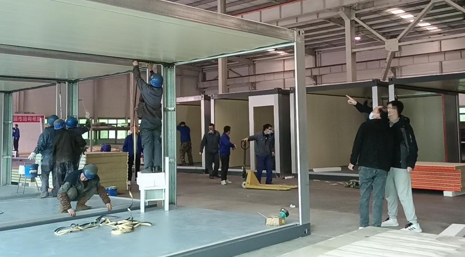 在施工现场,为保证隔离方舱顺利交付,项目经理组织协调各施工队伍分工合作,同一功能区先行打造样板间,样板引路,加快施工节奏。施工计划细化到小时,及时总结,动态调整人员分工。