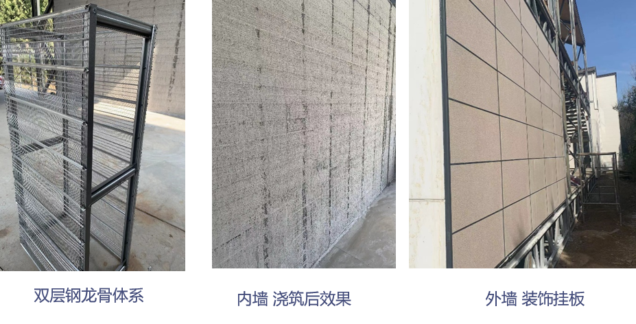 采用双层钢龙骨+钢网,和集术钢框架主体结构经浇筑后紧密结合形成实心墙体,不易空鼓开裂,防撞抗冲击,抗震防灾性能好。